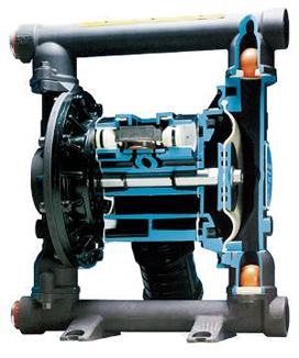 氣動雙隔膜泵采用壓縮空氣、氮氣或天然氣作為動力。主定向(氣動)控制閥將壓縮空氣分配至氣體腔室,向隔膜的內(nèi)表面上施加均勻壓力。同時排出的氣體從泵另一側后方通過氣閥組件導向端口排出。